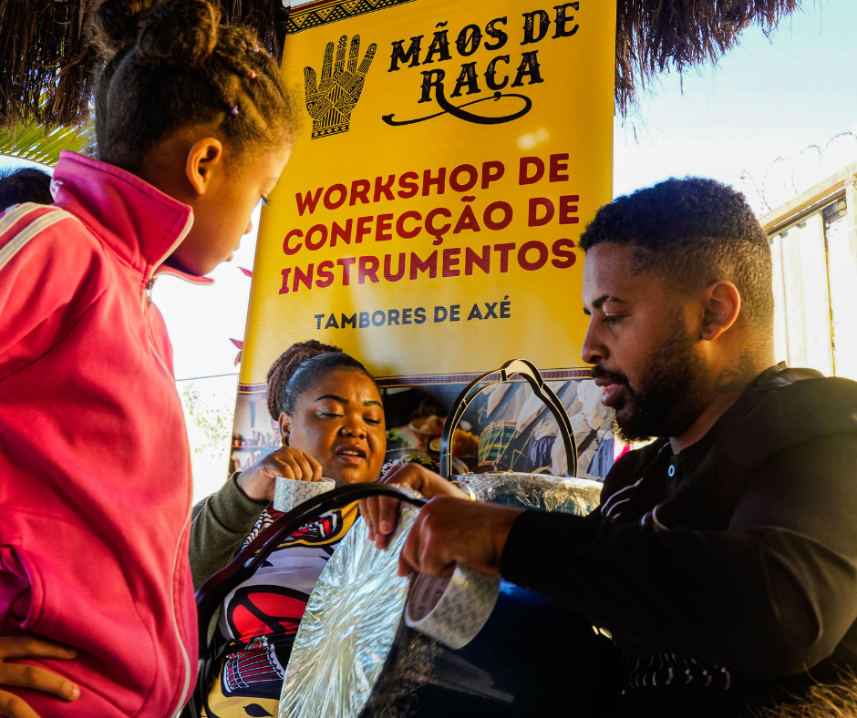 Tambores de Axé - O workshop de confecção de instrumentos proporcionou uma imersão na percussão afro-brasileira. A vivência musical uniu expressão criativa, consciência ambiental e valorização da cultura ancestral através da construção de instrumentos, exploração de ritmos tradicionais e práticas coletivas. -