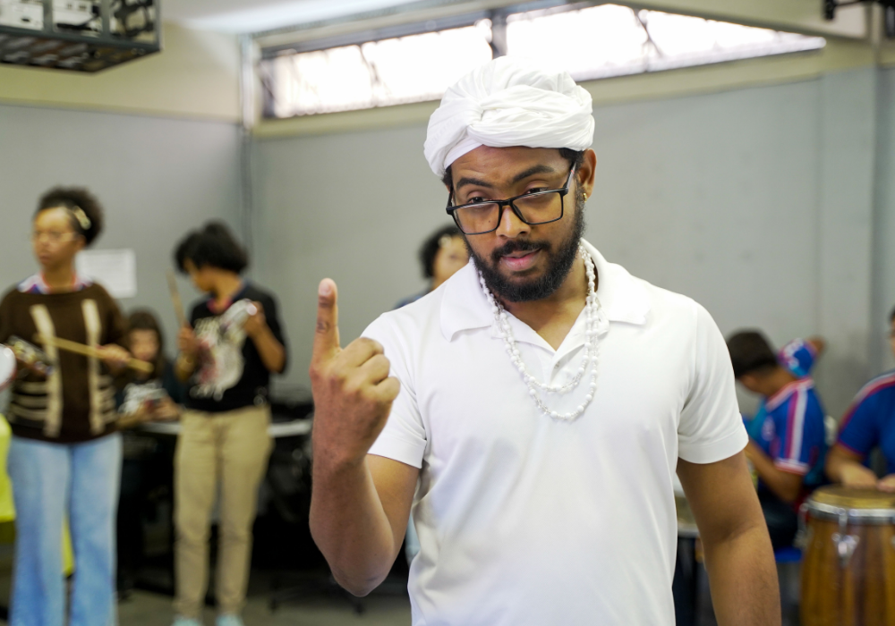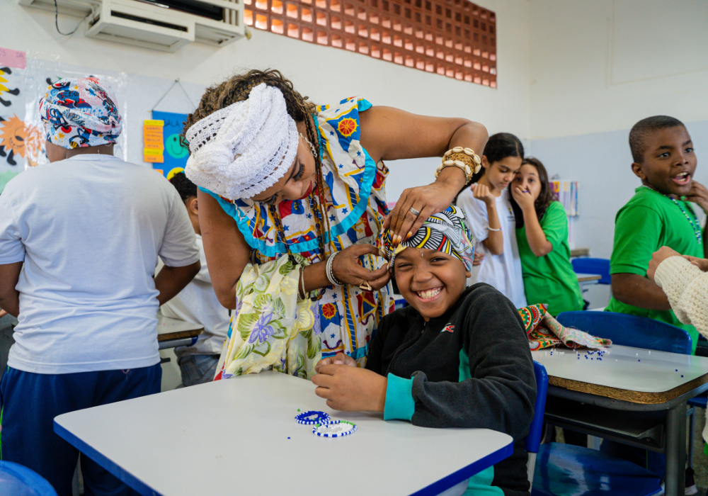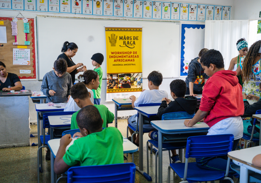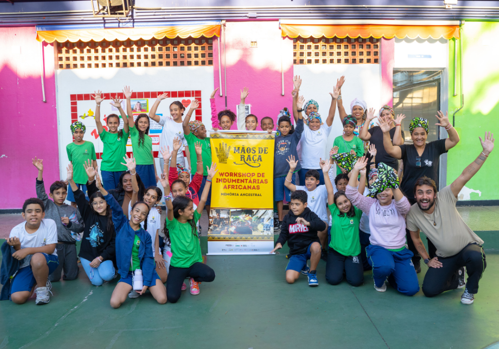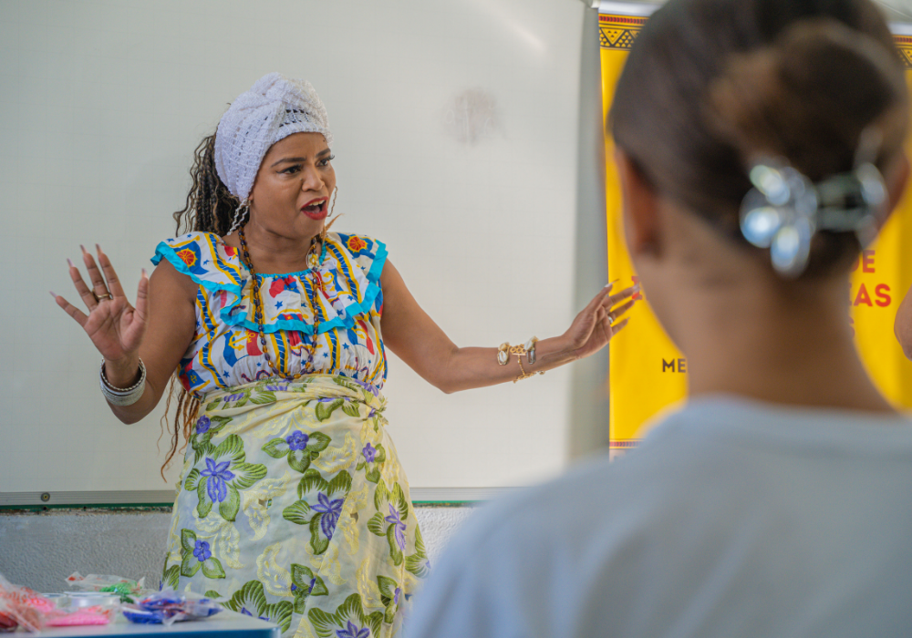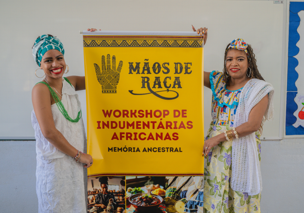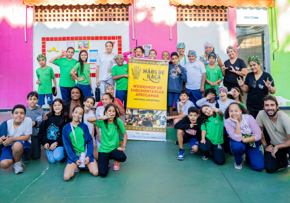 No workshop Memória Ancestral, os alunos vivenciaram a confecção de turbantes e fios de conta e aprenderam sobre seus significados. Uma aula viva de história, beleza e pertencimento.