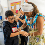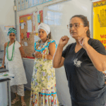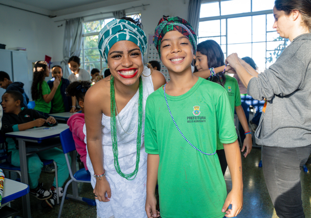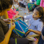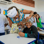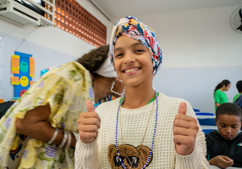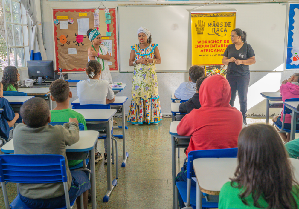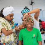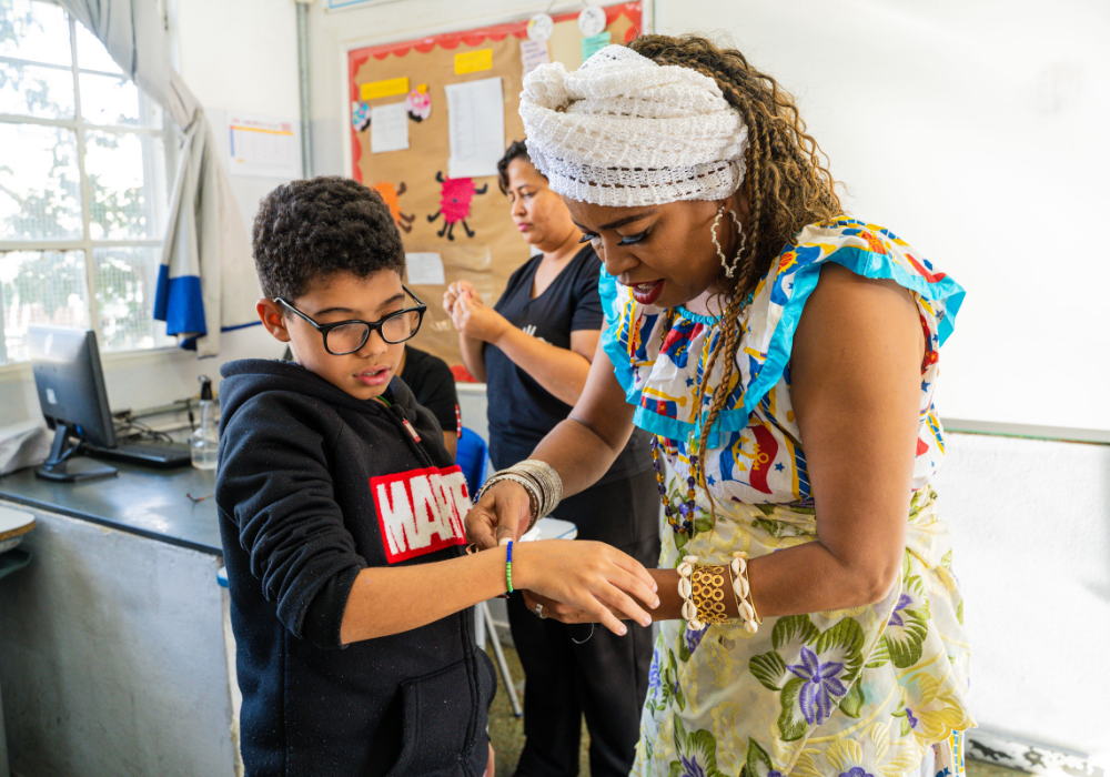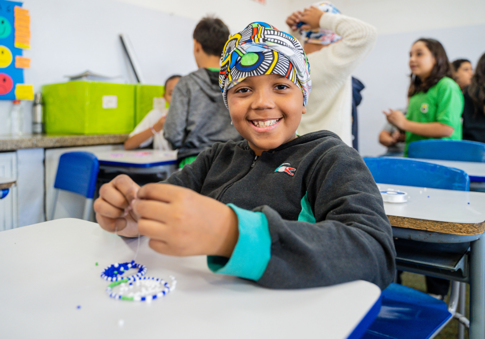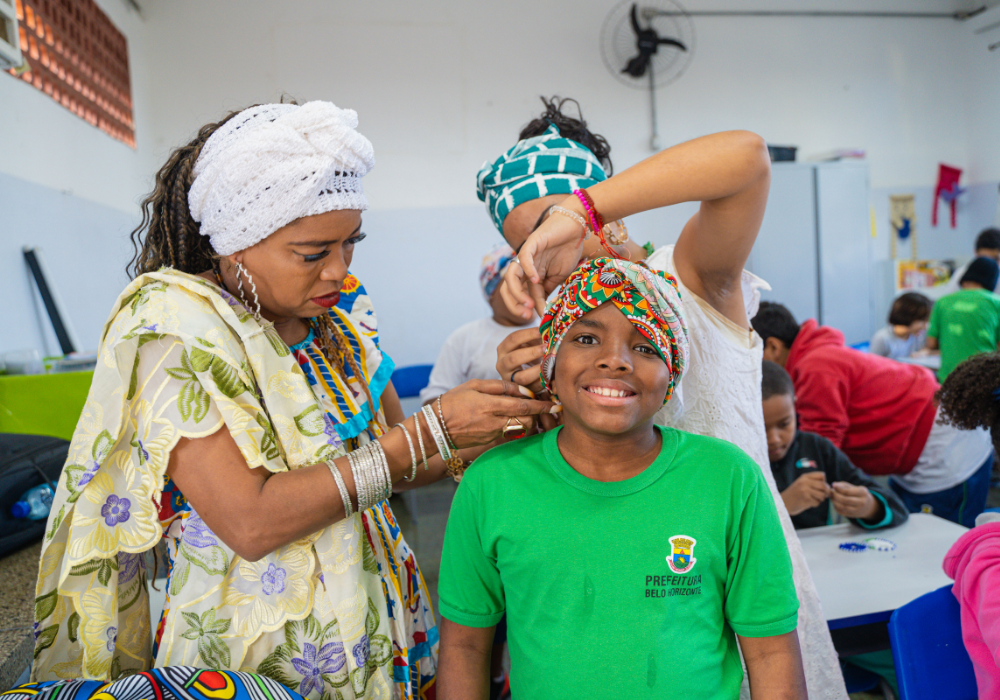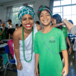 No workshop Memória Ancestral, os alunos vivenciaram a confecção de turbantes e fios de conta e aprenderam sobre seus significados. Uma aula viva de história, beleza e pertencimento.