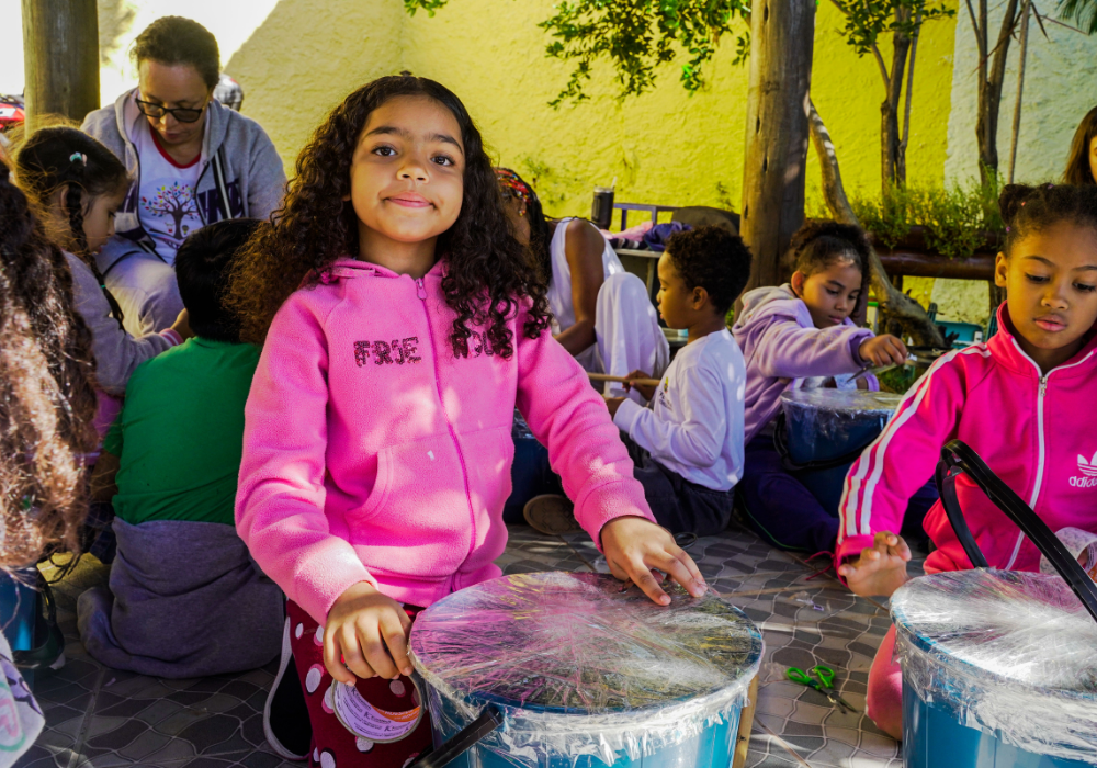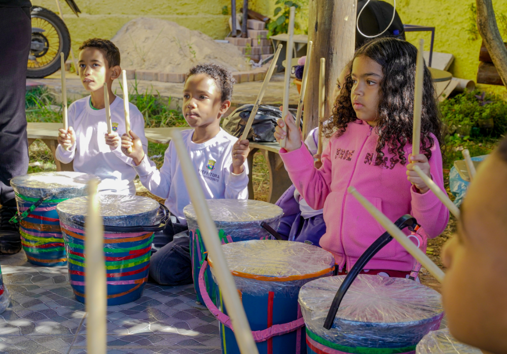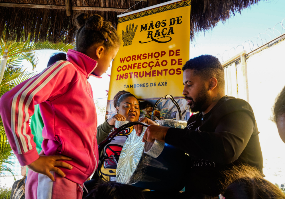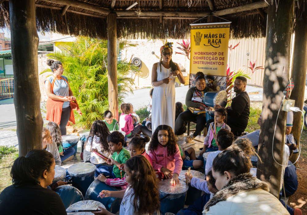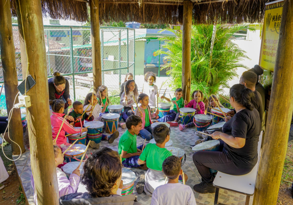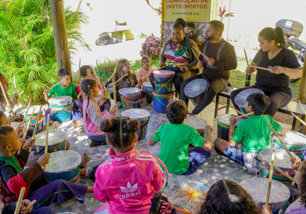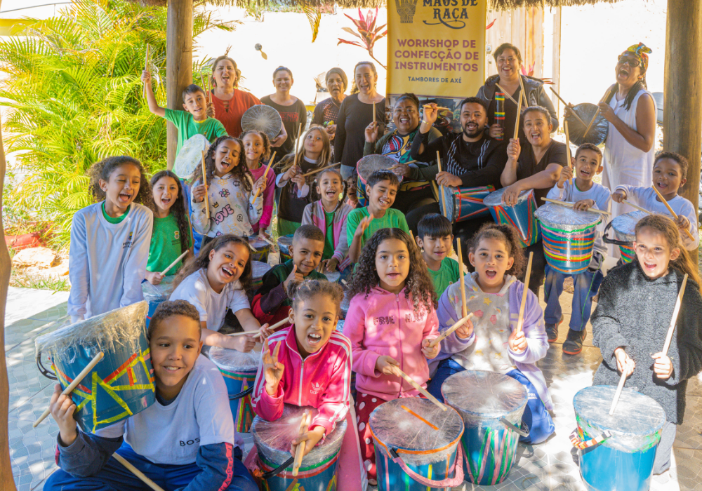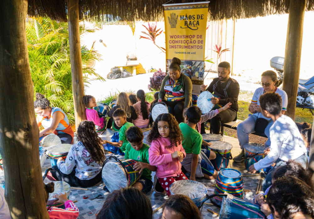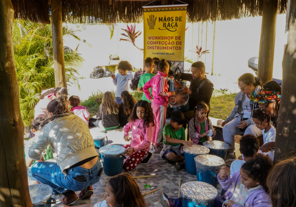 O workshop de confecção de instrumentos proporcionou uma imersão na percussão afro-brasileira. A vivência musical uniu expressão criativa, consciência ambiental e valorização da cultura ancestral através da construção de instrumentos, exploração de ritmos tradicionais e práticas coletivas.